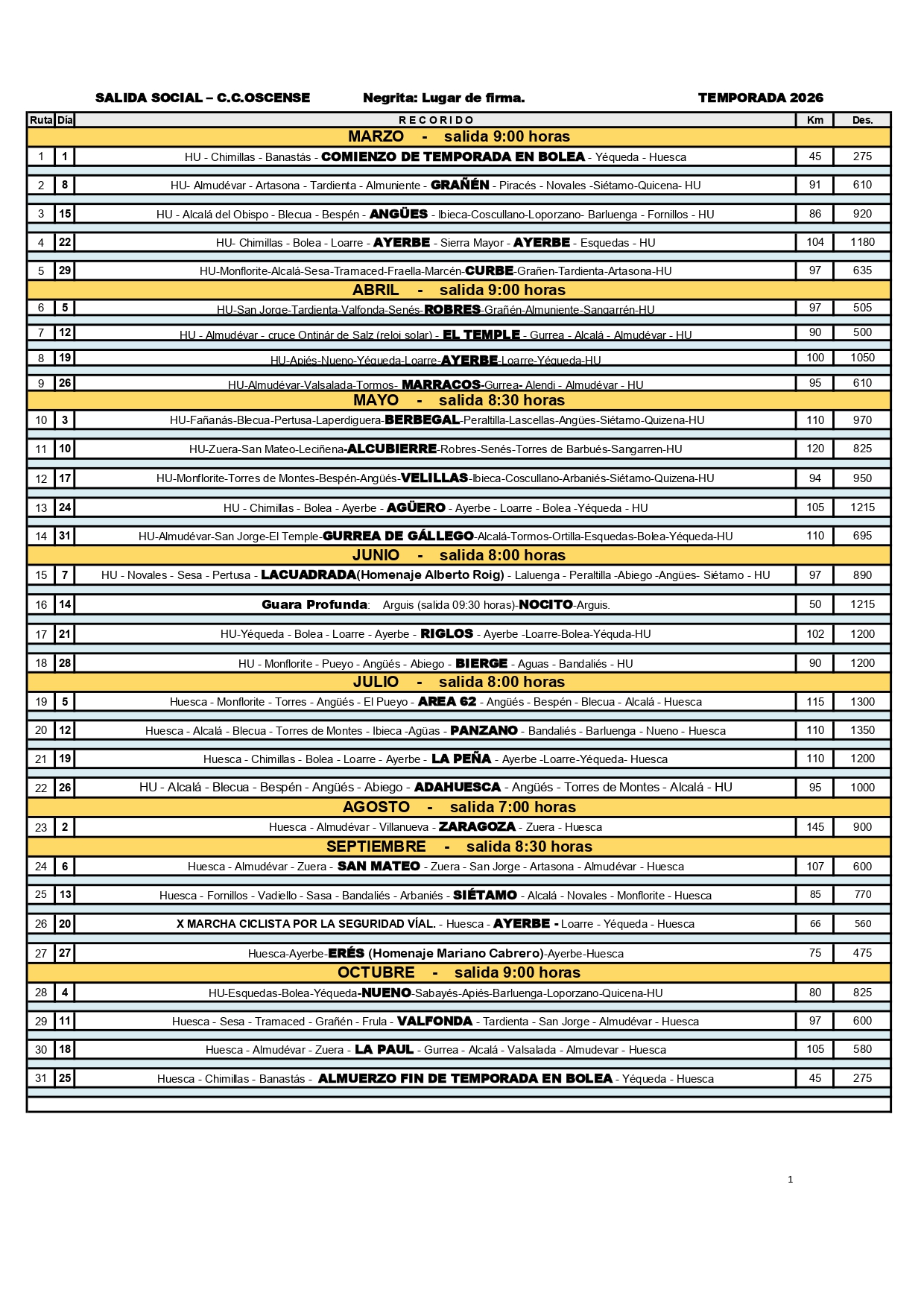 Consta de una serie de salidas cicloturistas que se realizan cada domingo, comenzando el primer fin de semana de marzo y finalizando el último de octubre. Éstas son preparadas con antelación, fijando los recorridos a comienzos de año, recorriendo muchas de las carreteras de la Hoya de Huesca, Monegros y Somontano y variando tanto en su longitud como en su exigencia a lo largo de toda la temporada: la salidas iniciales cuentan con kilometrajes más cortos y desniveles limitados y progresivamente se van aumentando con el fin de que estas salidas sirvan a nuestros cicloturistas a modo de preparación para sus objetivos de la temporada, que suelen ser las marchas cicloturistas más importantes del panorama nacional como son La Magia del Grial, la Quebrantahuesos/Treparriscos, etc.